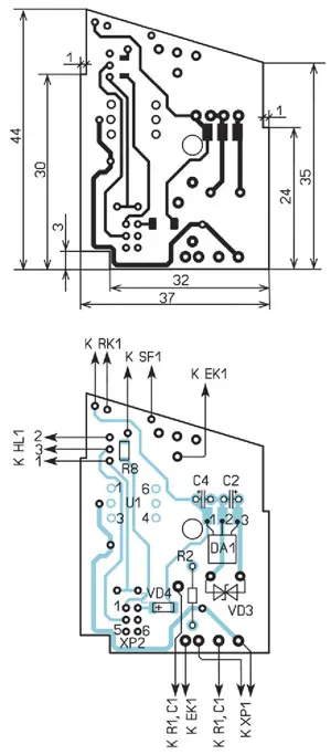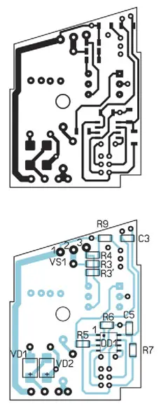 Печатная плата - двухсторонняя, она изготовлена из фольгированного стеклотекстолита толщиной 1...1,5 мм. Чертёж платы показан на рис. 2 и рис. 3. На ней установлен разъём XP2 для внутрисхемного программирования. Он изготовлен из IDE-коннектора неисправного HDD 2,5". Для этого выпилено три ряда, шаг - 2 мм и между рядами - 2 мм. Конденсатор С1 и резистор R1 установлены отдельно от платы и соединены с ней проводом МГТФ. Светодиод HL1 диаметром корпуса 3 мм закреплён в отверстии заглушки сзади рядом с отверстием загрузки клеевого стержня. К плате светодиод подключён тремя проводами МГТФ. Геркон SF1 размещён так, чтобы не мешать ходу курка, а на нём закреплён с помощью проволоки магнит, желательно мощный, для уверенного срабатывания геркона при лёгком нажатии на курок.