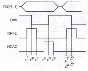 Аналогичным образом высокий уровень на линии NDAC (Not Data Accepted) или ДП (Данные Приняты) свидетельствует, что слушатель успешно принял информацию. Как и на линии NRFD, высокий уровень на линии NDAC невозможен, пока его не установили все слушатели. Временные диаграммы цикла пересылки байта показаны на рис. 1, где отмечены следующие характерные моменты времени: