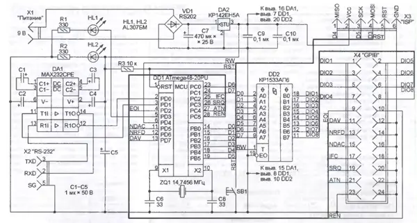 Схема разработанного автором преобразователя интерфейса GPIB в RS-232 показана на рис. 2. На разъем Х1 подают переменное или постоянное любой полярности напряжение питания. Диодный мост VD1 выпрямляет его или приводит к нужной полярности, а интегральный стабилизатор доводит до нужного для питания микросхем значения 5 В.