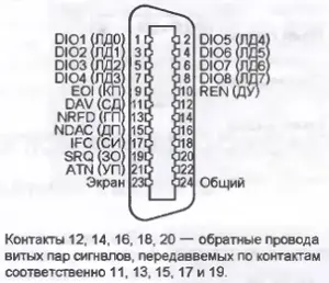 Информационные линии DIO1-DIO8 (ЛД0-ЛД7) образуют восьмиразрядную двустороннюю шину данных. Обычно информация передается в текстовом виде с использованием семиразрядного кода ASCII (American Standard Code for Information Interchange) или его отечественного эквивалента КОИ-7. Например, чтобы передать число 123, поочередно передают ASCII-коды цифр 1 (0110001), 2 (0110010) и 3 (0110011). По шине данных передают также интерфейсные команды, адреса и команды управления устройствами.