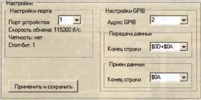 Запустив эту программу, необходимо, открыв показанную на рис. 5 вкладку "Настройки", указать номер СОМ-порта, к которому подключен преобразователь, и GPIB-адрес прибора, с которым предстоит работать, задать символы, обозначающие конец строки сообщения при передаче и приеме. В завершение настройки нажимают на экранную кнопку "Применить и сохранить".