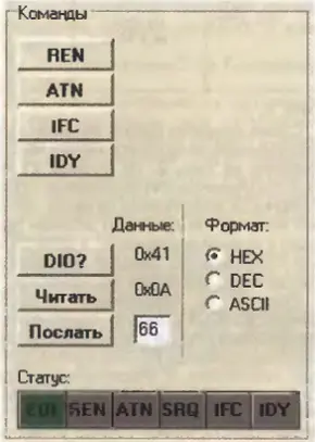 Нажатием на экранную кнопку ATN устанавливаем ATN=1 (низкий уровень на одноименной линии). Заметим, что после выполнения каждой операции текущее состояние линий управления автоматически отображается в нижней части вкладки. Адрес в формате, соответствующем отмеченному пункту поля "Формат", набираем в поле ввода рядом с экранной кнопкой "Послать" и нажимаем на эту кнопку. Устанавливаем ATN=0, отжав соответствующую кнопку.