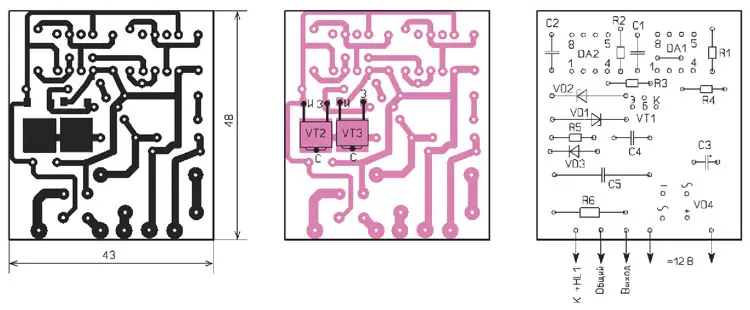 Чертёж печатной платы и схема размещения элементов генератора показаны на рис. 2. Плата изготовлена из одностороннего фольгированного стеклотекстолита толщиной 1...1,5 мм. Можно применить таймеры КР1006ВИ1, транзистор VT1 - любой маломощный, например, серий КТ3102, КТ315 (цоколёвка другая). Полевые транзисторы VT2, VT3 использованы от неисправной материнской платы компьютера. Резисторы - МЛТ, С2-3, оксидный конденсатор - К50-35, конденсатор С5 - серии К73-17, остальные - К10-17. Светодиод может быть любого свечения, диод VD3 - любой маломощный импульсный или выпрямительный, стабилитроны - на напряжение 12...15 В. В качестве корпуса использована пластмассовая коробка размерами 55x50x25 мм.