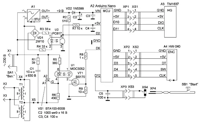 На рис. 1 показана схема доработанного аппарата контактной сварки. Он собран на популярном и дешёвом модуле Arduino Nano с индикацией на четырёхразрядном светодиодном дисплее - модуле А3. Питается устройство от модуля А1, который преобразует переменное напряжение 230 В в посто-янное стабилизированное напряжение 9 В. На диодном мосте VD1 и оптроне U2 собран датчик перехода переменного напряжения через ноль, резисторы R3 и R4 - токоограничивающие. На коллекторе фототранзистора оптрона U2 формируются короткие положительные импульсы при переходе сетевого напряжения через ноль, два импульса на один период. Этот датчик нужен для синхронизации включения симистора VS1. Чтобы он включался на пике полуволны, в программе Arduino Nano сделана регулируемая задержка от 1 до 5 мс для изменения времени задержки его включения. Управляется симистор VS1 с помощью симисторного оптрона U1 MOC3052 без узла детектора ноля. Обратите внимание, что оптрон MOC3063 и аналогичный, в котором присутствует детектор ноля, использовать нельзя.