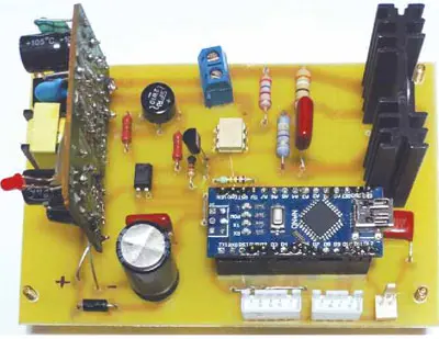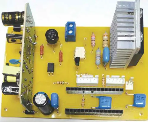 Для увеличения силы тока при сварке применены два трансформатора Т1 и Т2, обмотки которых включены параллельно. Вместо симистора BTA41A, как в прежнем варианте, применён более мощный симистор ВТА100, а вместо трёх плат почти все элементы размещены на одной, которая рассчитана на установку любого симистора, BTA100 или BTA41A, по желанию конечного пользователя. Смонтированные платы, имеющие небольшие отличия и с разными симисторами, показаны на рис. 2 и рис. 3.