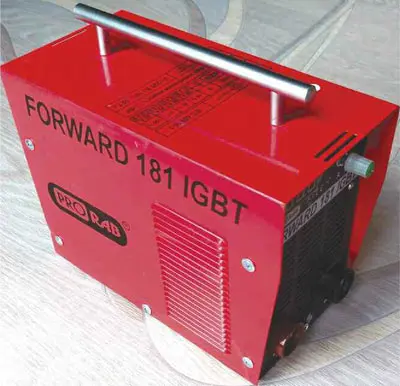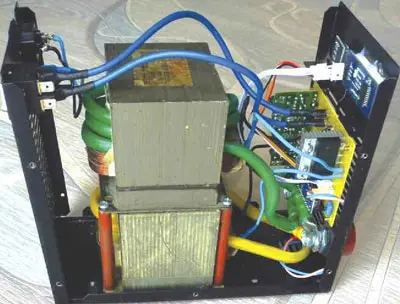 Аппарат контактной сварки собран в корпусе от неисправного сварочного инвертора подходящих размеров, например, как на рис. 4. Расположение элементов в корпусе показано на рис. 5. Нижний трансформатор закреплён на дне корпуса, а верхний - на стойках высотой 80 мм над нижним трансформато ром. Вторичные обмотки трансформаторов с помощью болтов подключены к выходным разъёмам корпуса от сварочного инвертора. Плата управления, индикатор и эн-кодер закреплены на передней стенке корпуса, для них в этой стенке сделаны отверстия соответствующей формы и размера.