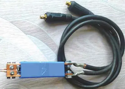 Сварочная рукоятка подключается к аппарату с помощью проводов от сварочного инвертора и разъёмов от него проводом сечением 35 мм2 и длиной 90 см, она показана на рис. 6. Полностью собранный и готовый к работе аппарат показан на рис. 7.
