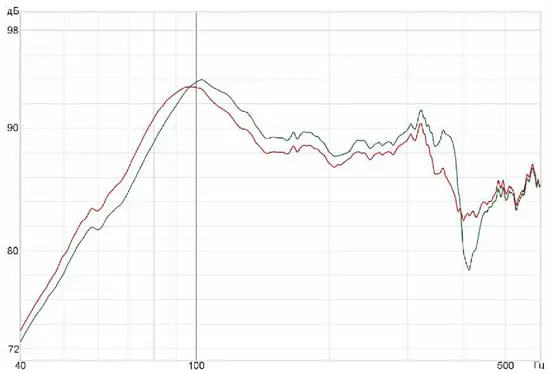 Подача постоянного тока в звуковую катушку динамической головки влечёт за собой изменение параметров громкоговорителя [6]. Например, на рис. 3 представлены АЧХ в ближнем поле одной и той же АС, реализованной на динамической головке 10ГДШ-1 в акустическом оформлении "закрытый ящик". Красная кривая соответствует постоянному току в звуковой катушке +0,5 А, зелёная кривая - постоянному току -0,5 А. Как видим на рис. 3, форма АЧХ заметно изменяется при изменении полярности подключения АС.