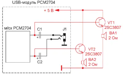Автором также был собран УМЗЧ с внешним USB ЦАП на микросхеме PCM2704. Схема этого УМЗЧ приведена на рис. 4. Такой УМЗЧ можно использовать, например, с ноутбуком. ЦАП микросхемы PCM2704 обеспечивает на выходе синусоидальный сигнал напряжением около 0,6 В. При этом напряжение постоянного тока на эквиваленте нагрузки сопротивлением 2 Ом - около 1 В, постоянный ток в нагрузке - примерно 0,5 А. Как видно на рис. 4, усилитель каждого канала состоит из единственного элемента - транзистора. Более того, из схемы ЦАП исключены выходные разделительные конденсаторы. КГИ усилителей при номинальном выходном напряжении 0,6 В - менее 1 %. Для такого внешнего ЦАП/УМЗЧ питание вместе с сигналом можно взять с гнезда USB-3. Поскольку одного порта USB-2 для питания недостаточно, для этой цели можно задействовать еще один порт USB-2. Следует иметь в виду, что связка ЦАП/УМЗЧ потребляет мощность до 5 Вт, что повышает нагрузку на батарею ноутбука.