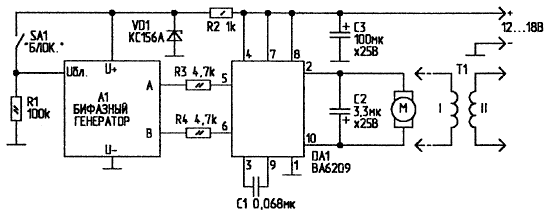На рис.3 приведена схема автомата для инкубатора. В этой схеме выходные сигналы бифазного генератора А1 управляют работой коллекторного электродвигателя через микросхему сервоусилителя DA1. Эта микросхема - драйвер заправки кассеты видеомагнитофона - включена по стандартной схеме. Работа автомата проста - высокий уровень на выходе А приводит к вращению вала электродвигателя в одну сторону, а "1" на выходе В - в противоположную (рис.2, диаграмма 3). Во время паузы (tn) двигатель заторможен. Временное отключение автомата осуществляется выключателем SA1 "Блокировка". При этом на обоих выходах бифазного генератора - низкий логический уровень.