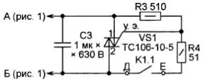 Если контакты имеющегося реле недостаточно мощные, подключать пусковой конденсатор к двигателю можно с помощью симисторного узла, собранного по схеме, изображённой на рис. 2. Его подключают к точкам А и Б исходной схемы вместо показанных там контактов реле и конденсатора СЗ. Симистор VS1 выбирают исходя из коммутируемого напряжения и тока. Контакты К1.1 теперь включены в цепь управляющего электрода симистора, где ток очень мал.