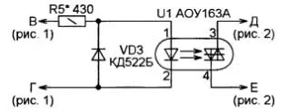 Чтобы вообще отказаться от электромагнитного реле, его можно заменить симисторным оптроном по схеме, приведённой на рис. 3. Входную цепь оптрона подключают к точкам В и Г (см. рис. 1) вместо обмотки реле К1 с обязательным соблюдением полярности, а выходную - к точкам Д и Е (см. рис. 2) вместо контактов К1.1. Диод VD3 защищает излучающий диод оптрона от обратного напряжения, приложенного к нему при разрядке конденсатора С4.