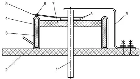 К верхнему закруглённому срезу кольца 4 провода должны прилегать, по возможности, плотнее, зазоры между ними заливают эпоксидной смолой. Внутрь кольца 4 туго вставлена вырезанная из листового изоляционного материала центрирующая шайба 7 с отверстием для латунного вала 1. Шайбу 7 тоже крепят эпоксидной смолой. Такое же отверстие, как в центрирующей шайбе 7, сверлят в основании 2.