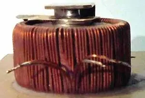 Упругий подвижный контакт 5 с отверстием для шарика 6 припаивают ближе к верхнему концу вала 1. На нижний конец вала 1 надевают две металлические шайбы 8 и пропускают вал через отверстие в центрирующей шайбе 7, затем сквозь кольцо 4 с обмоткой (повёрнутое контактной поверхностью вверх) и, наконец, через отверстие, просверленное в основании 2.