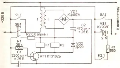 Контакты К 1.1 блокируют "сетевую" группу контактов кнопки, и ее можно отпустить, прибор продолжит работу. Контакты К2.1 замыкают цепь управляющего электрода симистора VS1. Симистор начинает открываться в каждом полупериоде сетевого напряжения. через него на вентилятор поступает переменное напряжение 220 В и вентилятор работает Благодаря сими-стору, выдерживающему ток до 5 А он может быть довольно мощным.