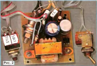 Трансформатор Т1 следует выбирать с переменным напряжением на обмотке II на 1...2 В больше постоянного напряжения срабатывания реле. А номинальное напряжение конденсаторов С1 и С2 должно быть в 1,5...2 раза больше напряжения на этой обмотке. Резистор R2, ограничивающий до безопасного значения ток зарядки конденсатора С1 можно изготовить из отрезка нихромо-вой проволоки. Точно подбирать его сопротивление нет необходимости