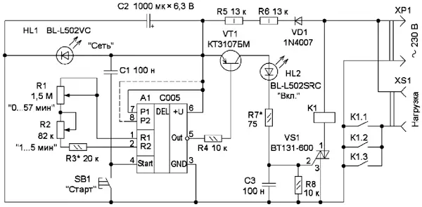 По окончании времени выдержки на выходе "Out" модуля А1 появляется высокий уровень напряжения, транзистор VT1 закрывается, симистор открываться не будет, реле обесточит-ся и нагрузка окажется отключённой от сети. Для повторного запуска таймера надо кратковременно нажать на кнопку SB1.