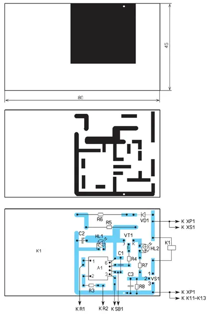 Большинство элементов установлены на печатной плате из фольгированного с двух сторон стеклотекстолита толщиной 1,5...2 мм. Чертёж платы показан на рис. 2. Монтаж элементов проводят со стороны печатных проводников (без отверстий). На другой стороне платы (верхняя на рис. 2) оставлена металлизированная площадка, которая через единственное отверстие соединена с минусовой линией питания модуля А1. Эта площадка выполняет роль экрана и защищает модуль А1 от наводок от сетевых проводов. Реле приклеивают к плате со стороны установки элементов.
