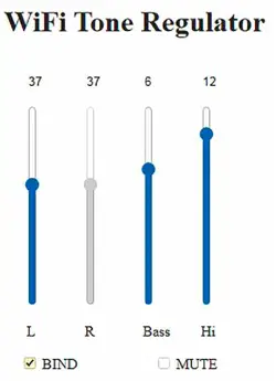 Внешний вид интерфейса управления темброблоком показан на рис. 1. Он имеет регуляторы уровней громкости левого (L) и правого (R) каналов, тембра НЧ (Bass) и ВЧ (Hi), а также дополнительные элементы (чекбоксы) режимов связанного управления громкостью (BIND) и оперативного отключения каналов (MUTE). Установленные значения параметров сохраняются в энергонезависимой памяти МК.