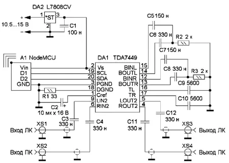 Детали. Модуль A1 - NodeMCU v3 (LoLin), микросхема DA1 - TDA7449. Интегральный стабилизатор DA2 - L7808CV с выходным напряжением +8 В или аналогичный. Допустимо использовать также стабилизаторы из серий 7806, 7809 с выходным напряжением +6 В или +9 В в корпусах TO-220 (FP). Все постоянные резисторы - С2-33Н или МЛТ Конденсатор C2 - К50-35, К50-68, все остальные - К10-17б или аналогичные импортные. Разъёмы XS1-XS4 - гнездовые RCA ("тюльпан") позолоченные.