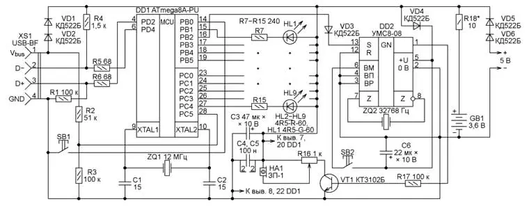 Использован один из типовых вариантов подключения микроконтроллера с его питанием пониженным напряжением через диоды VD1 и VD2. Применение этих диодов желательно несмотря на наличие аккумуляторной батареи, поскольку исключает влияние её напряжения на согласование логических уровней шины USB и микроконтроллера.