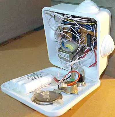 Разъём XS1 расположен на небольшой печатной плате, напротив него в стенке коробки вырезано отверстие соответствующих размеров. Элементы HA1, HL1, GB1, R16, SB1 зафиксированы на крышке коробки термоклеем. Кнопка SB2, не относящаяся к органам оперативного управления, находится на монтажной плате. На рис. 3 показано взаимное расположение монтажной платы и выносных элементов внутри распределительной коробки.