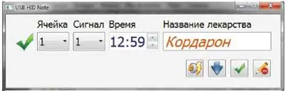 Для ввода расписания достаточно выбрать номер ячейки из первого выпадающего списка (селектора), а номер сигнала для этой ячейки - из второго списка. Затем установить нужное время подачи сигнала, щелчком по флажку слева от номера разрешить или запретить выбранную комбинацию ячейки и сигнала (при этом изменяется цвет флажка) и написать название препарата в единственной доступной строке. Название препарата привязывается к номеру ячейки, поэтому содержимое строки изменяется только при переключении первого селектора. Флаг разрешения относится к выбранной комбинации номеров ячейки и сигнала.