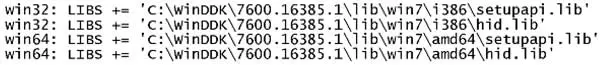 Особенность программы - прямое обращение к функциям библиотек SetupAPI и HID. Поэтому в компьютере, на котором происходит компиляция, необходимо наличие файлов setupapi.lib и hid.lib, соответствующих версии его операционной системы. Эти файлы обычно входят в пакет WinDDK. Чтобы не было необходимости полностью устанавливать весь пакет WinDDK, файлы различных версий из WinDDK 7600. 16385.1 собраны автором в одну папку winddk_libs, которая имеется на FTP-сервере редакции. Компиляция и отладка могут проводиться под ОС Windows 7, Windows Server 2008 R2, Windows Vista SP1, Windows Server 2003 SP1, Windows XP SP3 или более поздних. В файле .pro должны быть явно указаны полные пути к библиотекам, например, как в табл. 3.