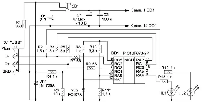 Предлагаемый пробник позволяет сократить время на тестирование и поиск неисправностей USB-портов материнских плат ПК и ноутбуков, не подключая их к источникам питания. Схема пробника показана на рис. 1. При тестировании USB-порта работающего компьютера он может питаться как от самого порта, так и от литиевого гальванического элемента CR2032 напряжением 3 В. Для индикации результата измерения используются два светодиода HL1 зелёного и HL2 красного свечения. В устройстве использован недорогой микроконтроллер (МК) PIC16F676-I/P, который обрабатывает полученные на линиях тестируемого USB-порта сигналы и сигнализирует об их состоянии включёнными светодиодами. Питание пробника осуществляется от элемента питания G1 при нажатой кнопке SB1. При подключении к работающему компьютеру на кнопку нажимать не надо, питание на пробник поступает с USB-порта через нормально замкнутые контакты кнопки SB1 и параметрический стабилизатор R1VD1, понижающий напряжение питания с 5 В до 3,3 В. За состоянием гальванического элемента следит встроенный в МК компаратор, на входы которого напряжение поступает через узел R8VD2R10R11. Для экономии питающее напряжение на этот узел подаётся с выхода RC5 только в период измерения. Делитель напряжения R4R6 формирует сигнал для МК для контроля за наличием напряжения питания на выводах исследуемого USB-порта.