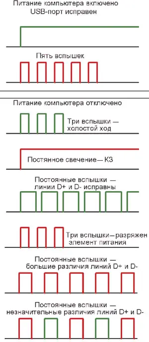 Если результаты измерений на линиях тестируемого USB-порта равны или близки по значениям, включается светодиод зелёного свечения с продолжительным свечением и короткой паузой. Если результаты отличаются незначительно, светодиоды включаются поочерёдно с частотой около 2 Гц. При значительных отличиях с частотой 1 Гц вспыхивает только светодиод красного свечения, а если измеренные значения близки к нулю или напряжению питания (короткое замыкание), этот светодиод светит постоянно.