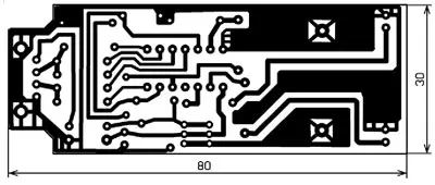 В зависимости от размеров корпуса пробник можно питать как от CR2032, так и от двух гальванических элементов типоразмера ААА или АА. Учитывая небольшое число деталей пробника, в авторском варианте - даже с учётом использования выводных компонентов, все они разместились на односторонней плате размерами 80x30 мм из фольгированного стеклотекстолита (рис. 3).