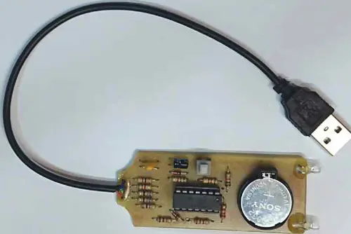 Чертёж размещения элементов на плате показан на рис. 4. Запрограммированный МК для уменьшения высоты устройства можно установить на плату без панели. После монтажа всех деталей на плату место установки и крепления USB-вилки и светодиодов для усиления жёсткости желательно обработать эпоксидным клеем. Также можно USB-вилку сделать выносной на кабеле длиной в 10-20 см, как в варианте, показанном на рис. 5. Затем пробник можно поместить в термоусаживаемую трубку соответствующего размера, вырезав отверстия для толкателя кнопки и элемента питания.