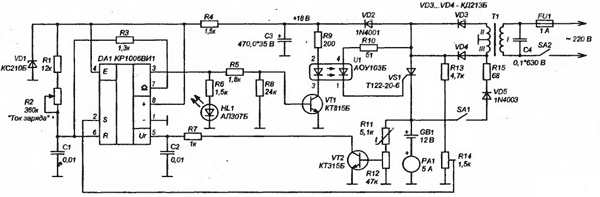 Вывод 5 микросхемы имеет прямой доступ к точке 2/3Un внутреннего делителя напряжения. По мере роста напряжения на аккумуляторе в конце заряда открывается транзистор VT2 цепи отрицательной обратной связи и снижает напряжение на выводе 5 DA1, создается модификация схемы и длительность импульса уменьшается, время нахождения тиристора в открытом состоянии снижается. Импульс с выхода 3 таймера через резистор R5 поступает на вход усилителя на.транзис-торе VT1. Усиленный транзистором VT1 импульс через оптопару U1 подает на управляющий электрод тиристора VS1 отпирающее напряжение, синхронизированное с сетью, тиристор открывается и подает в цепь аккумулятора импульс двухпо^-лупериодного зарядногатока с длительностью, зависящей от положения регулятора тока R2. Резисторы R9, R10 защищают оптопару от перегрузок.