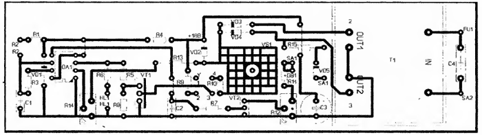 Элементы схемы, кроме выключателя, регулятора тока заряда, амперметра и предохранителя устанавливаются на печатной плате (рис. 2), остальное крепится в корпусе зарядного устройства.