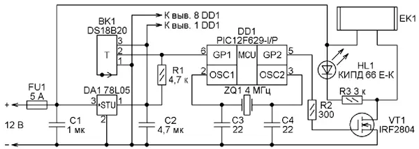 Другой вариант - связать продолжительность работы подогревателя кресла с температурой окружающей среды. Чем она ниже, тем длительнее должен работать подогреватель, а в тёплую погоду включать его вообще не требуется. Зависимость температура-продолжительность работы подогревателя придётся подобрать экспериментально. На рис. 1 представлена схема устройства, работающего по такому алгоритму. Оно содержит стабилизатор напряжения питания на микросхеме DA1, датчик температуры BK1, микроконтроллер DD1 и мощный ключ на полевом транзисторе VT1 в цепи питания подогревателя EK1.