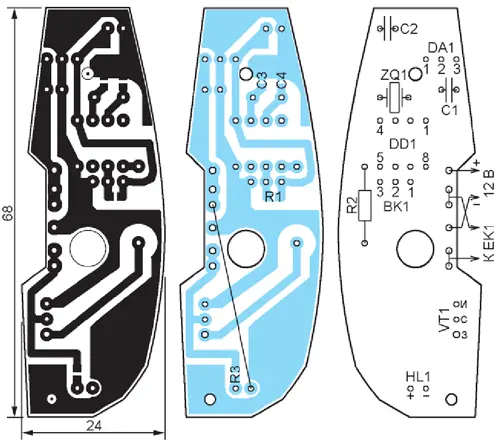Во втором варианте используется простейший отечественный подогреватель "Емеля" без каких-либо переделок. Плату устройства подогрева в этом случае изготавливают по чертежам рис. 6. Она рассчитана на установку всех резисторов и конденсаторов типоразмеров 0805 и 1206 и микроконтроллера PIC12F629-I/SN в корпусе SO-8. Вместо кварцевого резонатора на 4 МГц использован керамический CSTCC4M00G56/53-R0 на ту же частоту с встроенными в него конденсаторами, заменяющими конденсаторы C3 и C4.