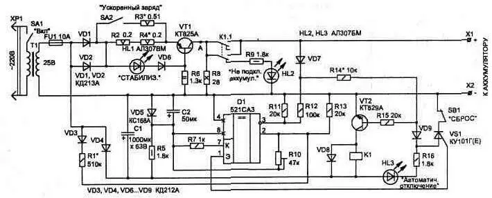 Устройство позволяет не только заряжать, но и восстанавливать аккумуляторы с засульфатированными пластинами за счет использования ассиметричного тока при зарядке в режиме заряд (5 А) - разряд (0,5 А) за полный период сетевого напряжения. В устройстве предусмотрена также возможность при необходимости ускорить процесс заряда.