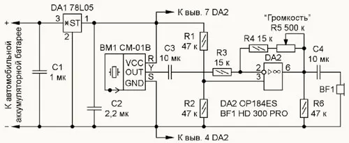 Выходной сигнал микрофонного датчика В1У11 усиливает инвертирующий усилитель DA2, он поступает на высококачественные головные телефоны ВF1 с сопротивлением катушки 64 Ом. Громкость в головных телефонах регулируют переменным резистором R5, коэффициент усиления усилителя изменяется от 2 до 35 раз. Питание прибора производится от автомобильной аккумуляторной батареи. Линейный стабилизатор DA1 понижает напряжение аккумуляторной батареи до 5 В.