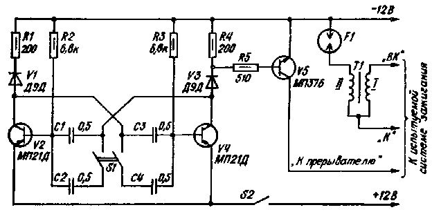 Работоспособность самодельных либо промышленных конденсаторных (тиристорных) систем зажигания целесообразно проверять перед установкой на автомобиль. Схема устройства для контроля таких систем зажигания, разработанная Л. Кузьминым, указана на рисунке. Устройство содержит симметричный мультивибратор, выполненный на транзисторах V2 и V4 и электронный ключ на транзисторе V5. С помощью описанного устройства имитируется работа распределителя зажигания, который для четырехцилиндрового двигателя при скорости вращения коленчатого вала 6000 об/мин осуществляет прерывание тока в первичной обмотке катушки зажигания с частотой 200 Гц. Поэтому при указанных на схеме номиналах элементов мультивибратора частота генерации приблизительно равна 200 Гц. Эту частоту можно понизить до 100 Гц путем подключения с помощью переключателя S1 дополнительных конденсаторов С2 и С4. С помощью электронного ключа лимитируется работа контактов прерывателя. Коллектор транзистора V5 подключается к цепи запуска тиристора в системе зажигания.