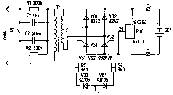 Со вторичной обмотки трансформатора Т1, ток в которой ограничен включением последовательно с первичной обмоткой балластного конденсатора (С1 или С1+С2), ток подается на диодно-тиристорный мост, нагрузкой которого является аккумуляторная батарея (GB1). В качестве регулирующего элемента применен автомобильный регулятор напряжения генератора (РНГ) на 14 В любого типа, предназначенный для генераторов с заземленной щеткой. Мною опробованы регулятор типа 121.3702 и интегральный -Я112А. При использовании "интегралки" выводы "Б" и "В" соединяются вместе и с "+" GB1. Вывод "Ш" соединяется с цепью управляющих электродов тиристоров. Таким образом, на аккумуляторной батарее поддерживается напряжение 14В при зарядном токе, определяемом емкостью конденсатора С2, которая ориентировочно рассчитывается по формуле: