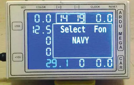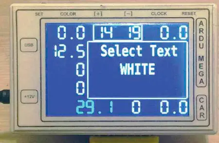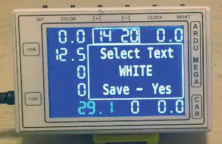 Для установки цвета фона и шрифта нажимают на кнопку COLOR до срабатывания сигнала зуммера. После первого нажатия на кнопку COLOR появляется возможность изменить цвет фона кнопками "+" и "-" с одновременной демонстрацией изменения (рис. 9), после второго нажатия на кнопку COLOR можно менять цвет текста (рис. 10), после третьего нажатия на кнопку COLOR предлагается сохранить все изменения цвета (рис. 11 ), а после четвёртого нажатия на кнопку COLOR происходит выход в основное меню. Цветовая гамма состоит из восьми цветов.