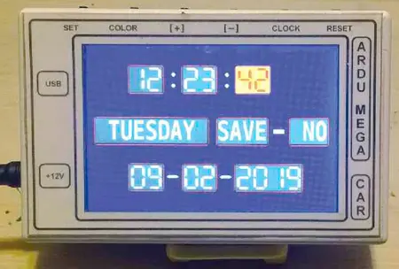 CLOCK до сигнала, и кнопками "+", "-" изменяют выбранный параметр, который подсвечен полем жёлтого цвета (рис. 12). Выбирают изменяемый параметр нажатием на кнопку CLOCK по кольцу. В конце предлагается сохранить все изменения времени кнопками "+", "–", и после нажатия на кнопку CLOCK выходят в основное меню.