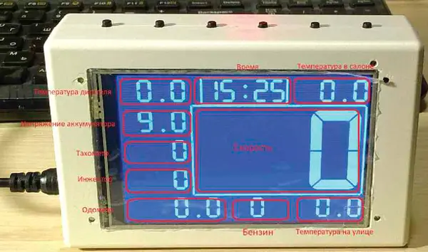 На дисплей выводится информация о скорости автомобиля большим шрифтом, температуре двигателя, напряжении аккумуляторной батареи, частоте вращения коленчатого вала двигателя, длительности импульса инжектора, пройденного пути, количестве бензина в баке, времени, температуре в салоне и на улице (рис. 8).