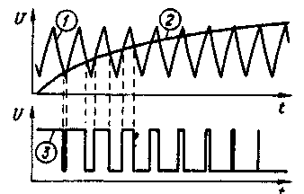 Генератор на операционном усилителе DA1.1 вырабатывает напряжение треугольной формы с частотой 150... 200 Гц (график 1 на рис. 2), которое поступает на неинвертирующий вход ОУ DA1.2. Пока включен дальний свет (в положении ножного переключателя света SA2, показанном на схеме), конденсатор С2 разряжен через резистор R7, диод VD3 и нить ближнего света лампы EL1 (на схеме показана одна лампа из двух) и напряжение на выходе ОУ DA1.2 около 10,5 В. Транзистор VT1 в это время открыт, а транзисторы VT2, VT3 выключены, так как коллектор и эмиттер транзистора VT3 замкнуты контактами переключателя SA2.