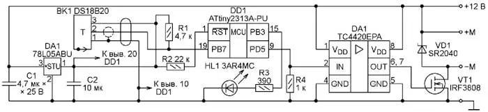 Информацию о температуре считывает с датчика микроконтроллер ATtiny2313A-PU (DD1), который тактируется импульсами частотой 1 МГц от внутреннего RC-генератора. Пропорционально температуре он регулирует напряжение питания двигателя вентилятора и, следовательно, частоту вращения его ротора. На двигатель поступает импульсное напряжение, постоянная составляющая которого, определяющая частоту вращения, зависит от коэффициента заполнения (отношения длительности импульсов к периоду их повторения). Коэффициент заполнения программа задаёт восьмиразрядными двоичными числами, загружаемыми в регистр сравнения работающего в режиме ШИМ таймера микроконтроллера.
