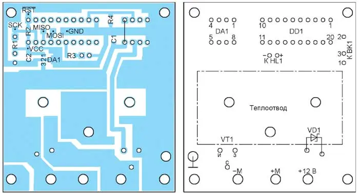 Все печатные проводники платы, по которым течёт ток двигателя вентилятора, должны быть покрыты слоем припоя толщиной не менее 0,7... 1 мм, а сечение подводящих проводов должно обеспечивать пропускание этого тока.
