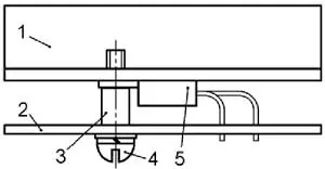 Принцип крепления транзистора 5 или диода к теплоотводу 1 и всего узла к печатной плате 2 показан на рис. 4. Диод изолирован от теплоотвода слюдяной прокладкой, а от крепящего винта 4 и металлической втулки 3 - изоляционной втулкой (изолирующие элементы на рисунке не показаны). Между корпусами диода и транзистора находится третья точка крепления теплоотвода к плате. Здесь он также закреплён винтом и втулкой.