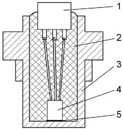 Датчик DS18B20 (ВК1) следует поместить в корпус от штатного контактного датчика температуры охлаждающей жидкости, из которого предварительно следует удалить всю "начинку". Такой корпус можно и выточить из латуни с сохранением габаритных и присоединительных размеров. Размещение датчика DS18B20 в корпусе показано на рис. 5. Датчик 4 с припаянным к его выводам разъёмом 1 помещают в полость корпуса 3 так, чтобы его верхушка, на которую нанесён слой теплопроводной пасты 5, касалась дна полости.