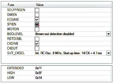 Если напряжение трогания двигателя вентилятора неизвестно, его можно определить экспериментально. Для этого в память микроконтроллера вместо рабочей программы нужно загрузить разработанную мной отладочную программу. В приложенном к статье файле Cooler-test.hex содержатся её коды. Конфигурацию микроконтроллера программируют одинаково для рабочей и тестовой программ в соответствии с рис. 6, где показано окно установки конфигурации программатора AVRISP mkII.