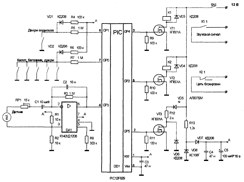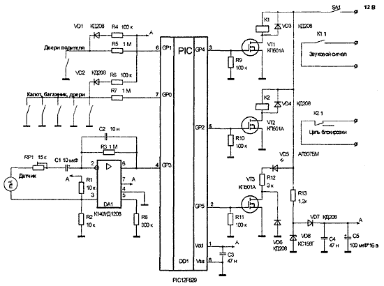 Схема на рис. 1 представляет собой модернизированный вариант автомобильной охранной системы АОС [1] с использованием новой элементной базы. Модернизация коснулась коррекции алгоритма работы охранной системы для микроконтроллера PIC12F629, изменения входных цепей приема сигналов от дверных включателей освещения, концевых выключателей капота и багажника, изменения схемы подключения светодиода.